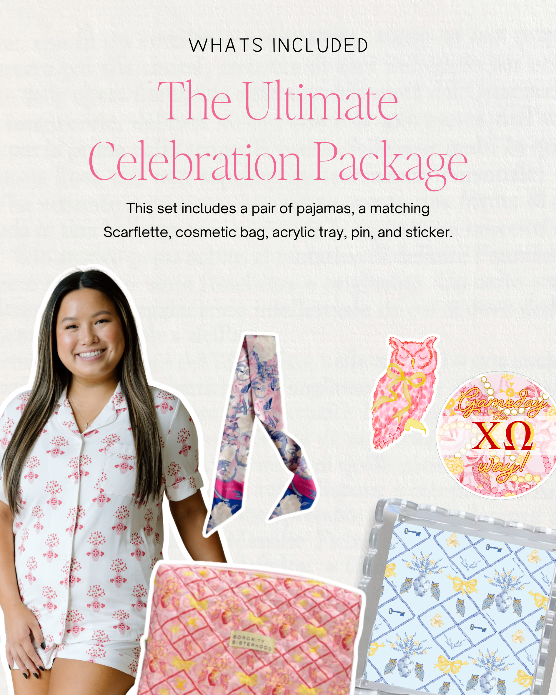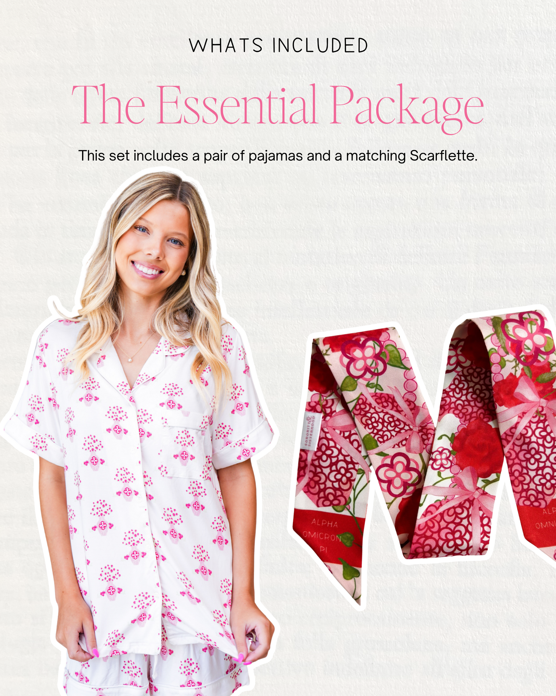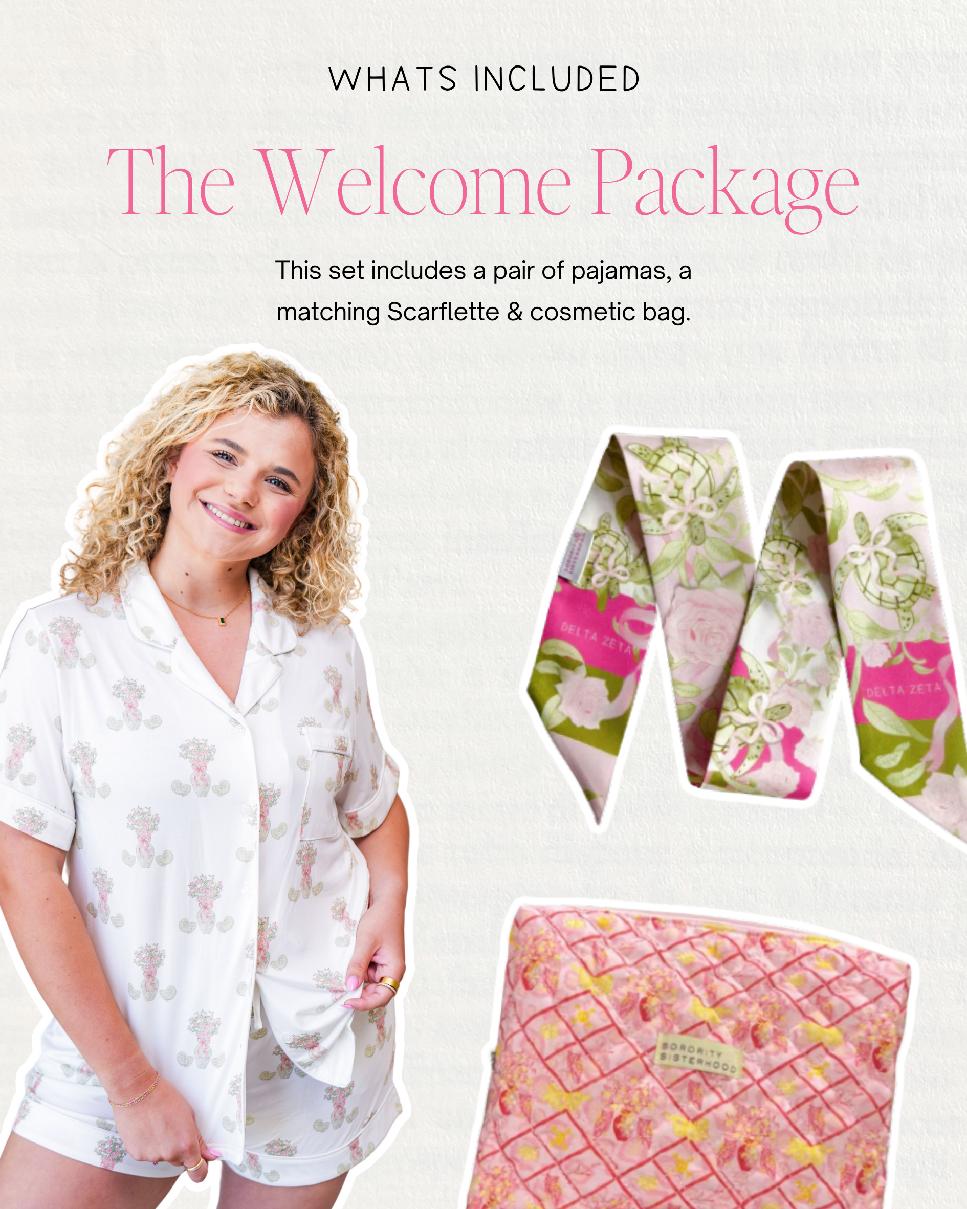 - Matching sorority scarflette™ in coordinating pattern (perfect for those first sisterhood sleepovers!)