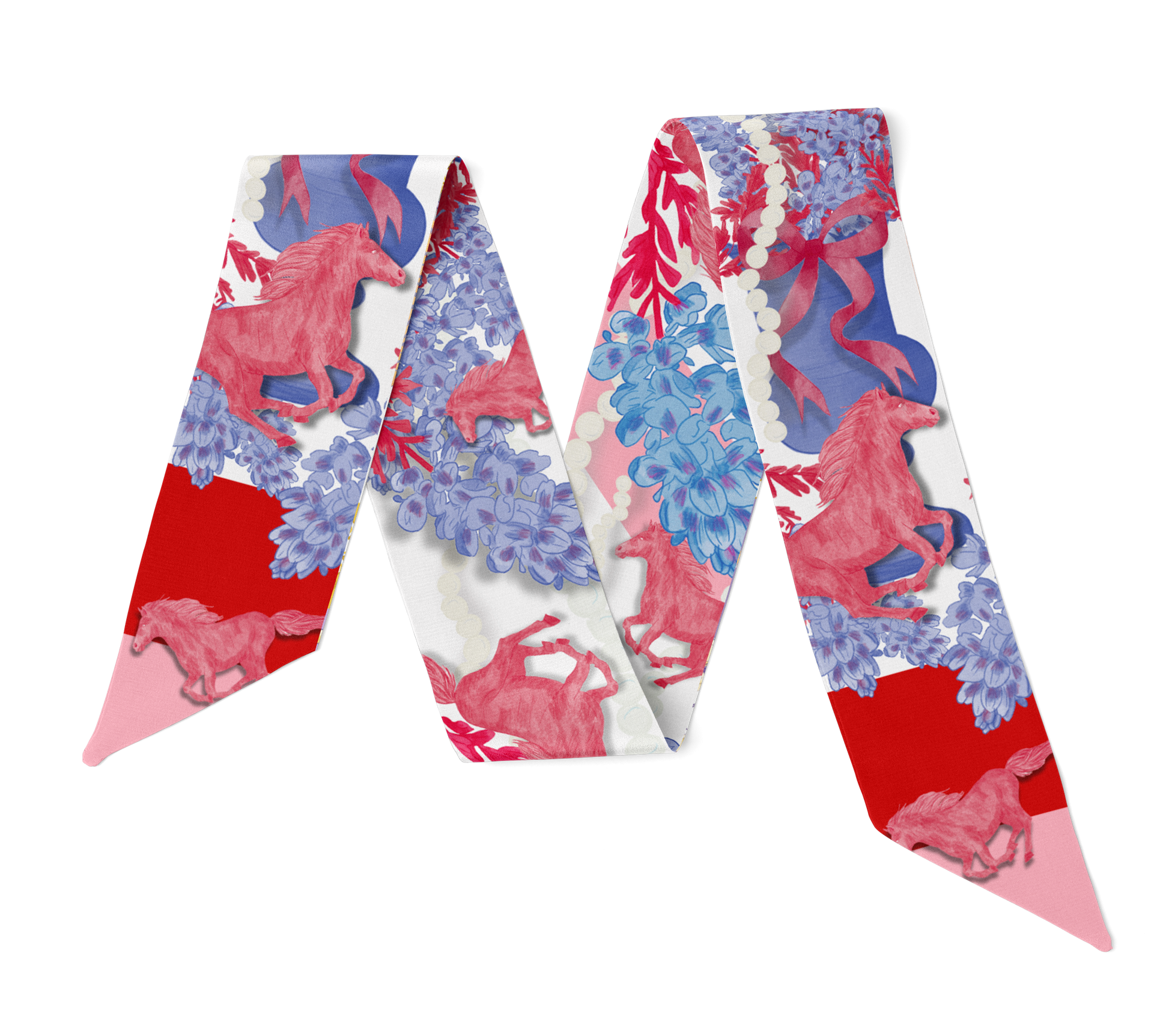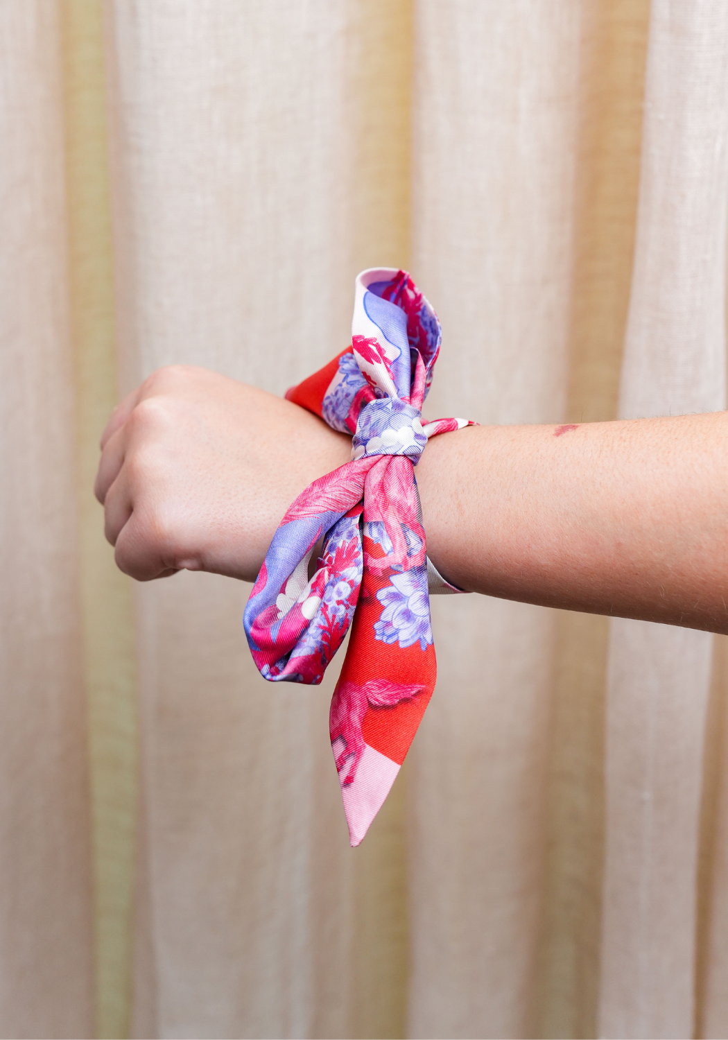 Crafted from premium silk twill, this versatile accessory can be worn in countless ways - wrapped around the neck, tied to a handbag, or adorning a ponytail. The bold color combination and floral elements make it the perfect statement piece for any wardrobe.