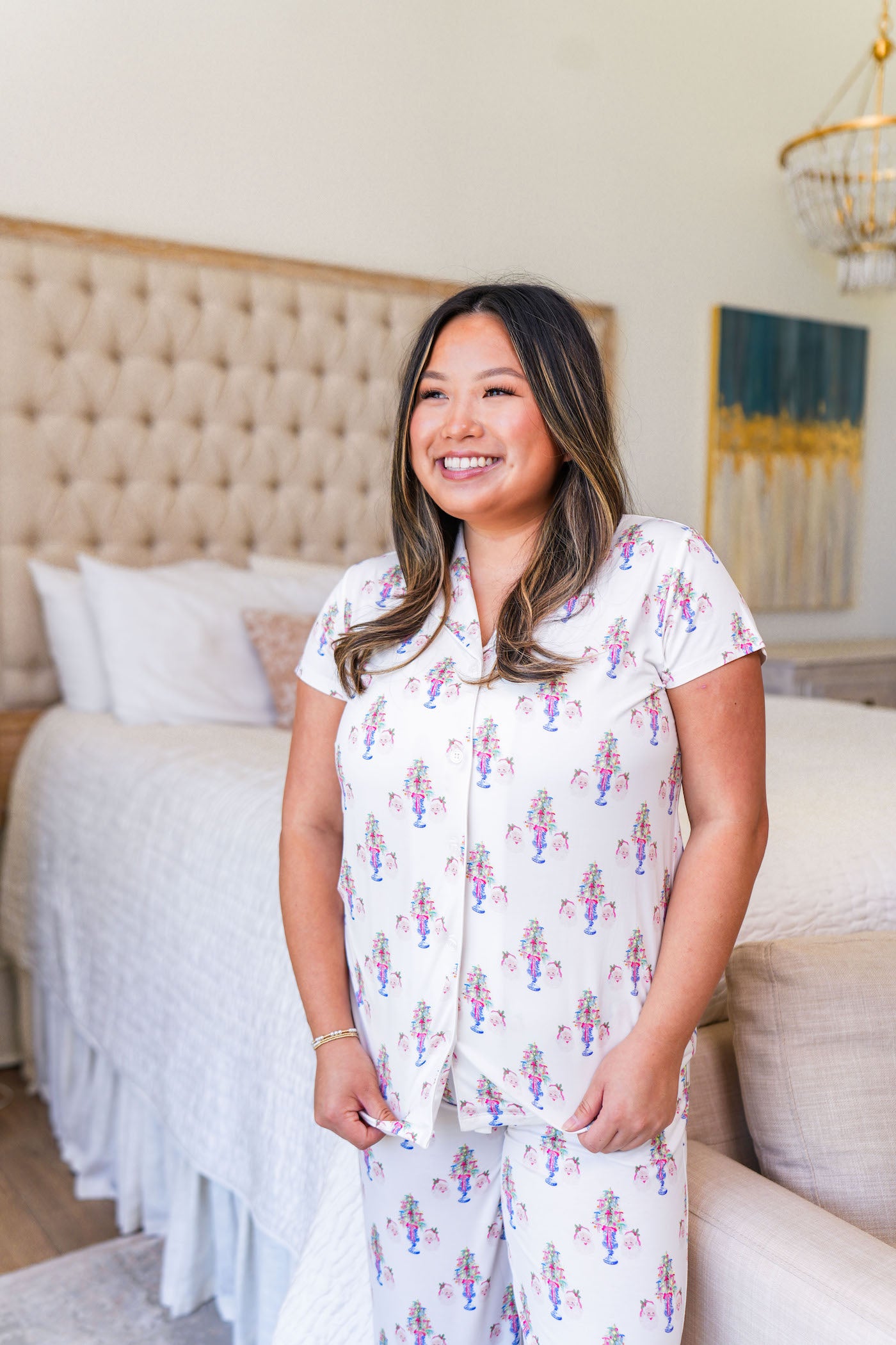 Introducing our festive Sassy Santa Heirloom Pajama Pants Set, featuring a playful and spirited print that brings holiday cheer with a touch of feminine flair. Designed in-house by our co-founder Elise, this delightful pattern showcases chic Santa figures adorned in vibrant pink and blue accents against a crisp white background, creating the perfect blend of Christmas magic and modern sophistication.
