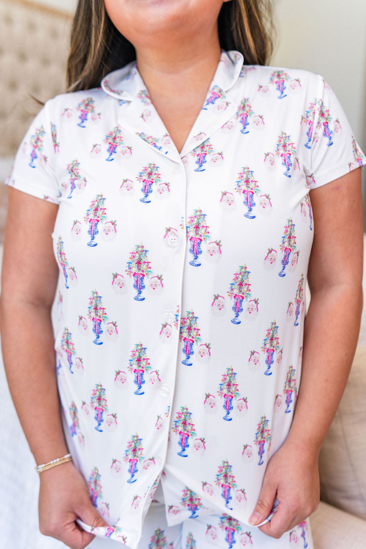 - Exclusive Sassy Santa print in pink, blue, and white